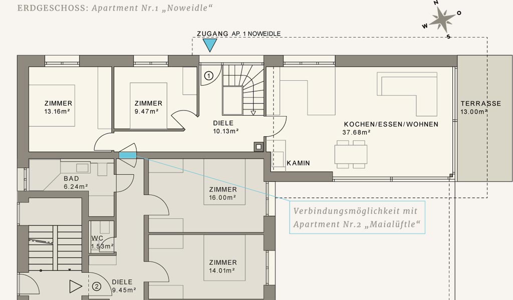 Das Chalet Apartment Noweidle ist ein Maisonette - Apartment mit einem loftähnlichen Wohnbereich. Durch die über zwei Seiten gehenden bodentiefen Fenster erleben Sie den unglaublichen Blick in die Natur auf besonders direkte Weise. Der offene Kamin, die voll ausgestattete Küche mit dem urig-gemütlichen Essplatz für 4 Personen und einer kleinen Theke am Küchenmittelblock, machen gemeinsame Abende zum Kochen oder einfach nur zum Genießen zum besonderen Erlebnis. Die Terrasse ist vom Wohnbereich zu betreten. Zwei absolut ruhig gelegene Schlafzimmer mit komfortablen Boxspringbetten garantieren Ihnen erholsame Nächte. Das Maisonette - Apartment verfügt über ein hochwertiges Badezimmer im Chaletflair mit bodengleichen Duschen, ein zusätzliches, separates WC und einen exklusiven privaten Saunabereich. Dieses Apartment kann auf Wunsch mit dem Apartment 02 „Mailüftle“ verbunden werden und ist dann besonders für den generationsübergreifenden Familienurlaub oder den Urlaub mit guten Freunden perfekt geeignet.